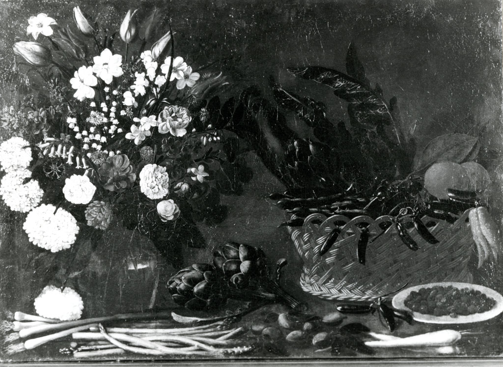 natura morta con vaso di fiori, frutta e ortaggi - dipinto