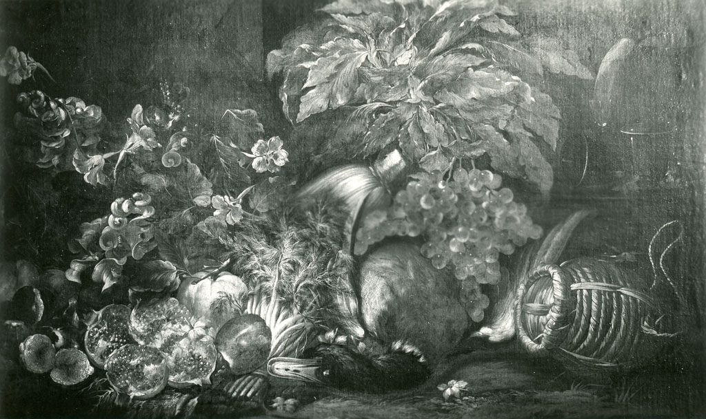 natura morta con fiori, frutta, verdura, cacciagione, fiasco di vino e bicchieri - dipinto - Firenze - Gli Uffizi