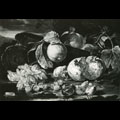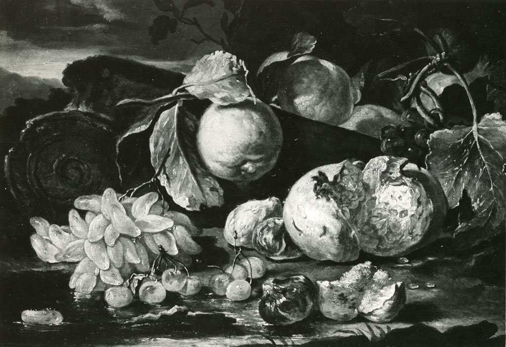 natura morta con melagrana, fichi, ciliegie, uva, limoni e frammento architettonico