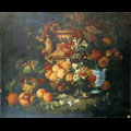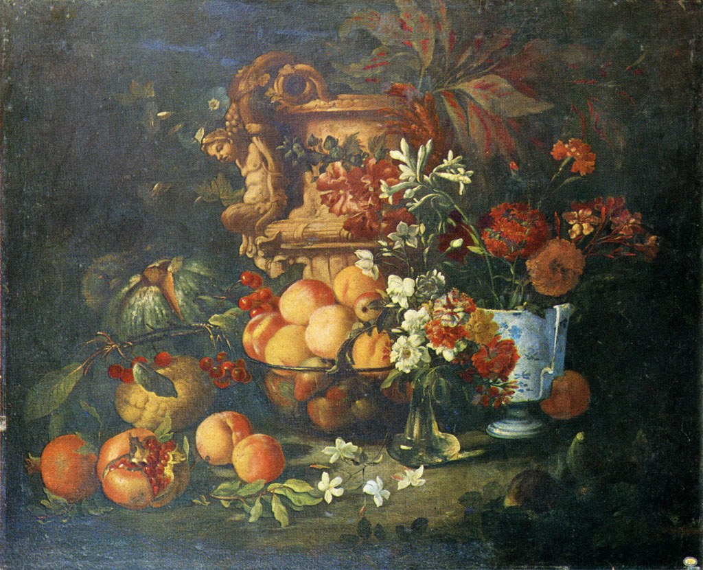 natura morta con vasi di fiori, frutta, zucca e anfora decorata