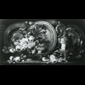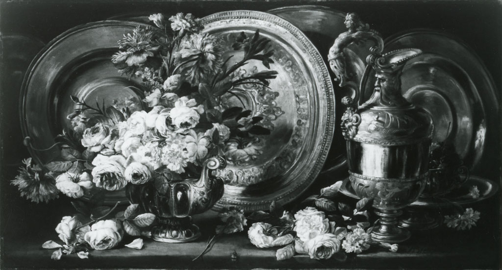 natura morta con vaso di fiori, piatti e anfora in argento - dipinto
