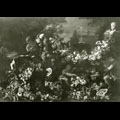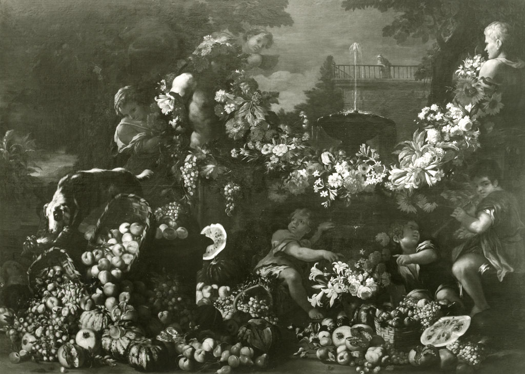 natura morta con cesti di frutta, ghirlanda di fiori, ornamenti da giardino, animali e figure - 1684 - dipinto