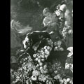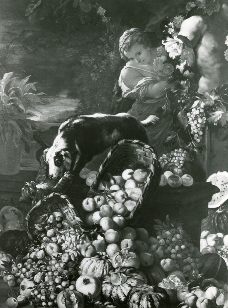 natura morta con cesti di frutta, ghirlanda di fiori, ornamenti da giardino, animali e figure - particolare - 1684 - dipinto