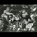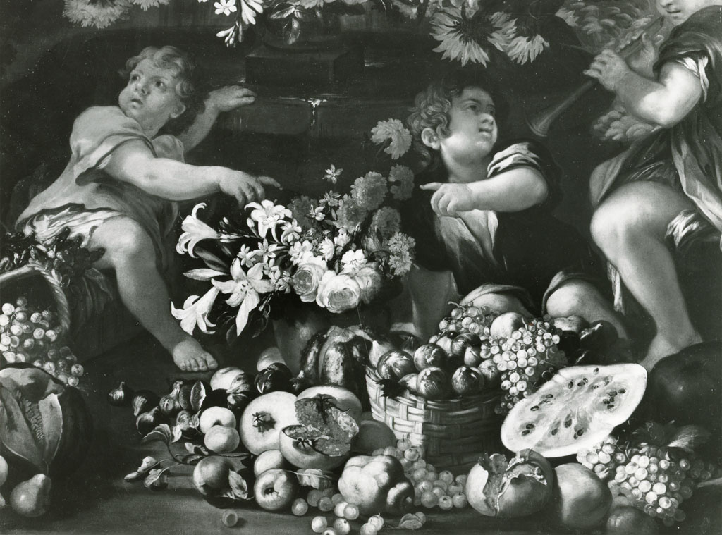 natura morta con cesti di frutta, ghirlanda di fiori, ornamenti da giardino, animali e figure - particolare - 1684 - dipinto