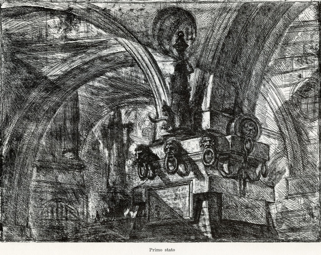 capriccio architettonico di una prigione con pilastro con mascheroni - stampa