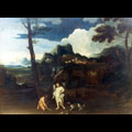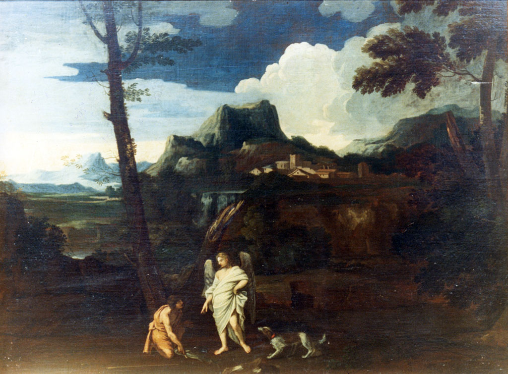 paesaggio con Tobia che porta il pesce e l'angelo - dipinto