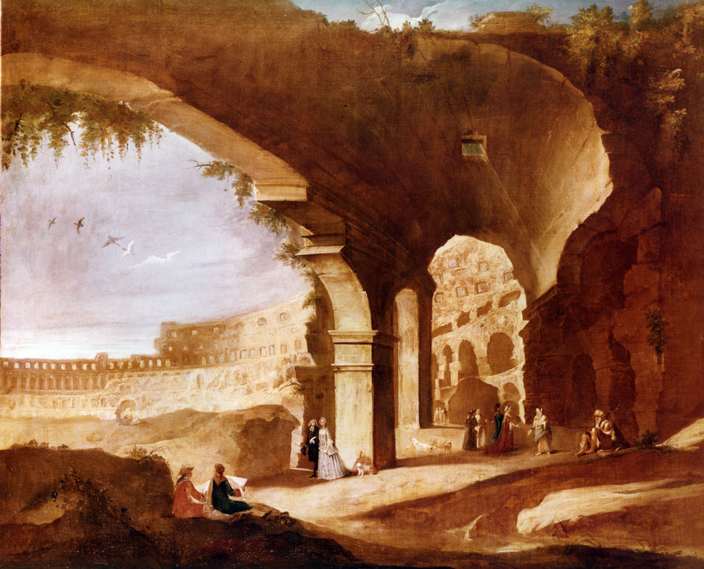 veduta di Roma con l'interno del Colosseo e figure - dipinto