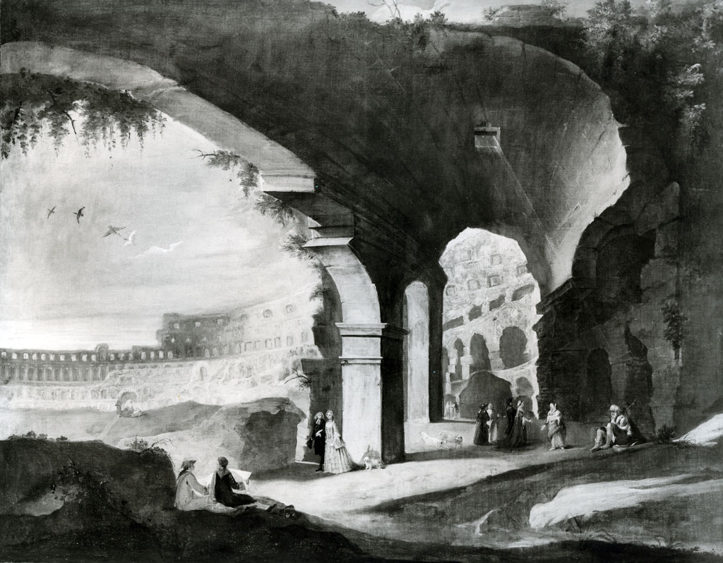 veduta di Roma con l'interno del Colosseo e figure - dipinto