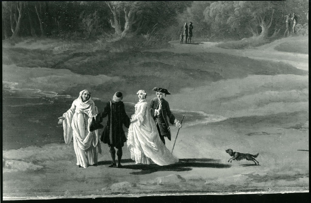 veduta del Tevere con Castel Sant'Angelo, la Basilica di San Pietro e figure - particolare - dipinto