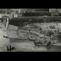 riva del fiume con barche, figure, animali e architetture