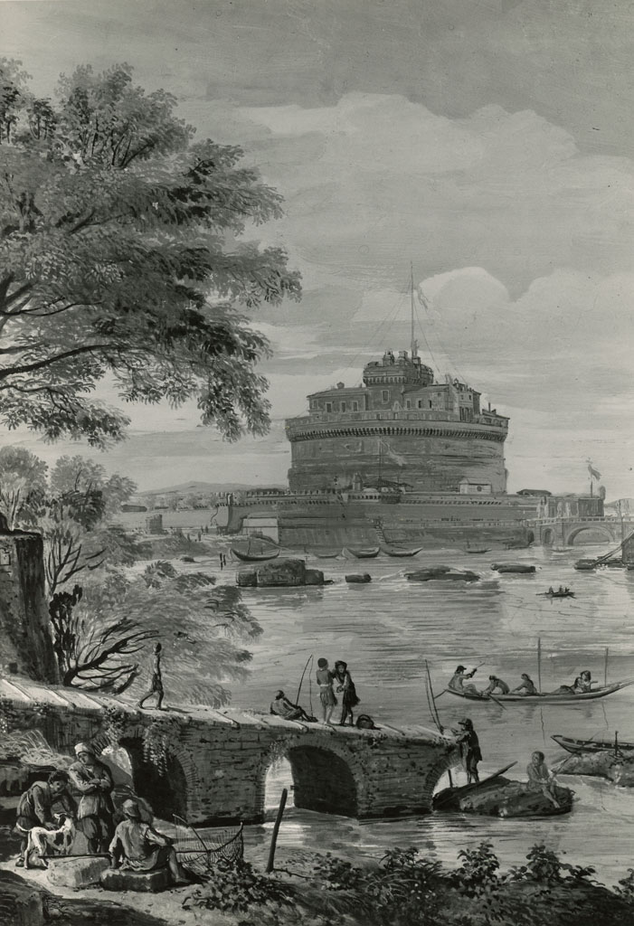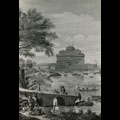 fiume Tevere con barche, figure e Castel Sant'Angelo