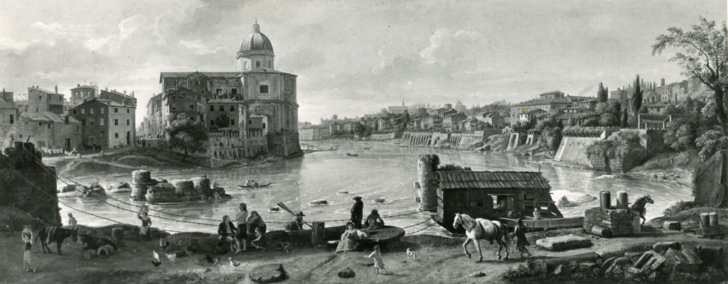 veduta del Tevere con via Giulia e la chiesa di San Giovanni dei Fiorentini - 1690 ca. - dipinto