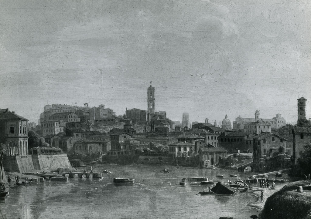 riva del fiume Tevere sullo sfondo con barche, figure e architetture