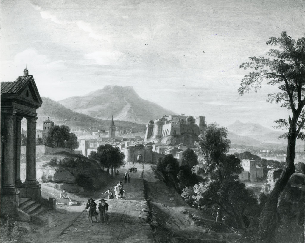 veduta di fantasia con paese e castello - 1712 - dipinto