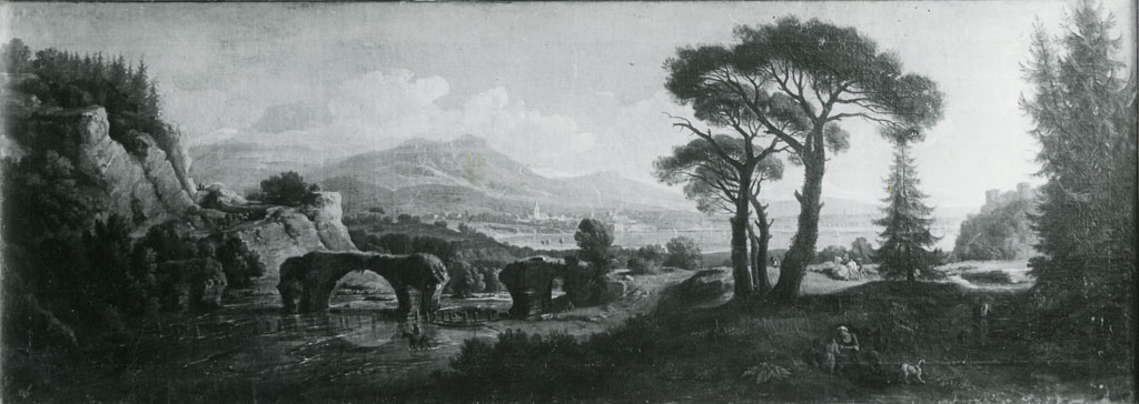 veduta di fantasia di paesaggio fluviale con rovine di ponte - dipinto